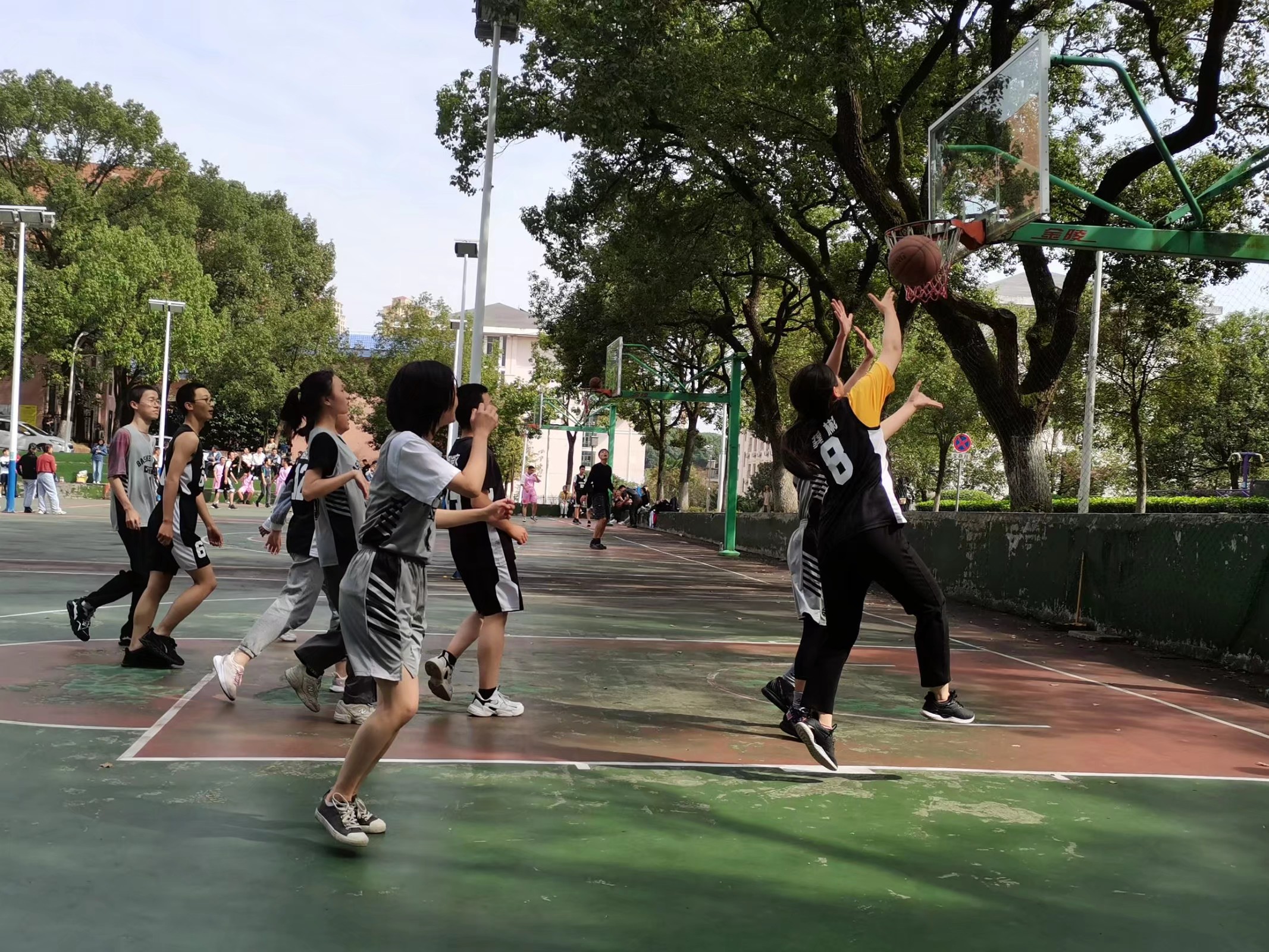 中场投篮环节,中文二班8号龚彬投球老练,发挥稳定;新闻一班17号侯禹竹进球精准,渐入佳境,获得可喜分数。新闻一班以30:20的比分扳下一城。第三节比赛开始,双方各自更换球员上场。中文二班继续进攻,9号毛泽越携球上阵,被新闻一班4号文韬拦下,3号王宏旭紧抓机会,接球、躲闪、周旋,传至11号田露投篮,田露进球失败。与此同时,中文二班6号龙思圪移步篮下似有夺球之意,谁料想,6号龙思圪将球传到新闻一班98号杨婷手中。这一象征友谊的传球引得场下阵阵掌声,好评不断。