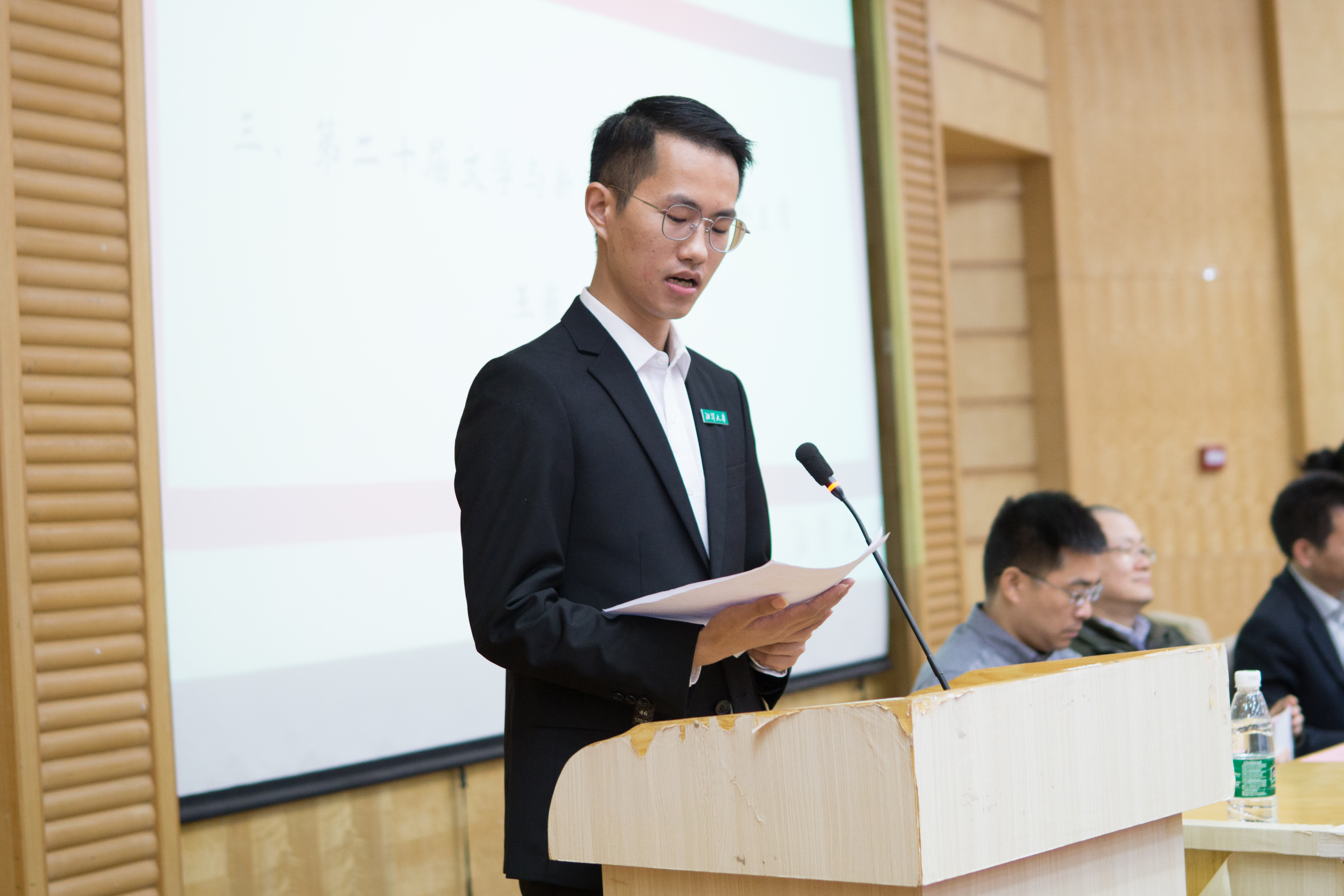 第二十研究生会主席王巍发言,他从组织、宣传、学术和文体工作四个方面详细汇报了过去一年研会在赵猛书记和林瑜老师的指导下所取得的优异成绩,同时他也期待在新一届成员的加入和助力下,研会能更好地服务师生,做出更好的成绩。