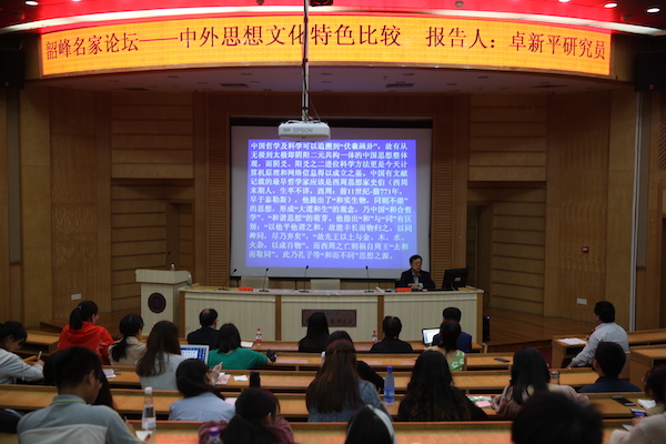卓新平研究员认为中西哲学在认识宇宙及人类自我上经历了“客体”“主体”和“整体”三个阶段,西方哲学伊始于古希腊哲学,其中关于“气”“光”“水”的宇宙本源论与中国儒家传统中的“天道”“阴阳”“上善若水”的哲学思想有异曲同工之妙。二者思维特征主要集中在神、人及其关系的探究上,而任何关于天、神、人关系的论述都是人的行为,因此承载和传播中西思想与传统的主体“士”精神又是探索中西思想文化的另一窗口。卓新平研究员在谈及中西文化核心观念及思想时,联系自己海外游学的几件趣事,向同学生动阐释中西文化观念的巨大差异,并以当下对外汉语教学中的孔子学院办学为例,指出孔子学院汉语教学中对孔子以及儒学思想的教育传播还有待提高。卓新平研究员在演讲中多次提及湖湘文化,表达了身为一名湘籍学者的自豪感,并对湖南知识分子给予了鼓励与肯定,强调发扬湖湘文化是每一名湘籍学者义不容辞的责任。