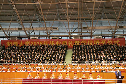 2018年毕业典礼暨学位授予仪式在体育馆隆重举行。本次典礼由校党委书记黄云清主持。出席毕业典礼的嘉宾有校领导周益春、高协平、宁建民、刘长庚、董康明、郑赤建、黄竹青、刘建平、刘长青,特邀嘉宾党的十九大代表、湘大99级哲学系校友,中国青年政治学院中国马克思主义学院副教授万资姿,以及来自全校各院系的毕业生家长代表,共同来见证2018 届毕业生这一重要时刻。