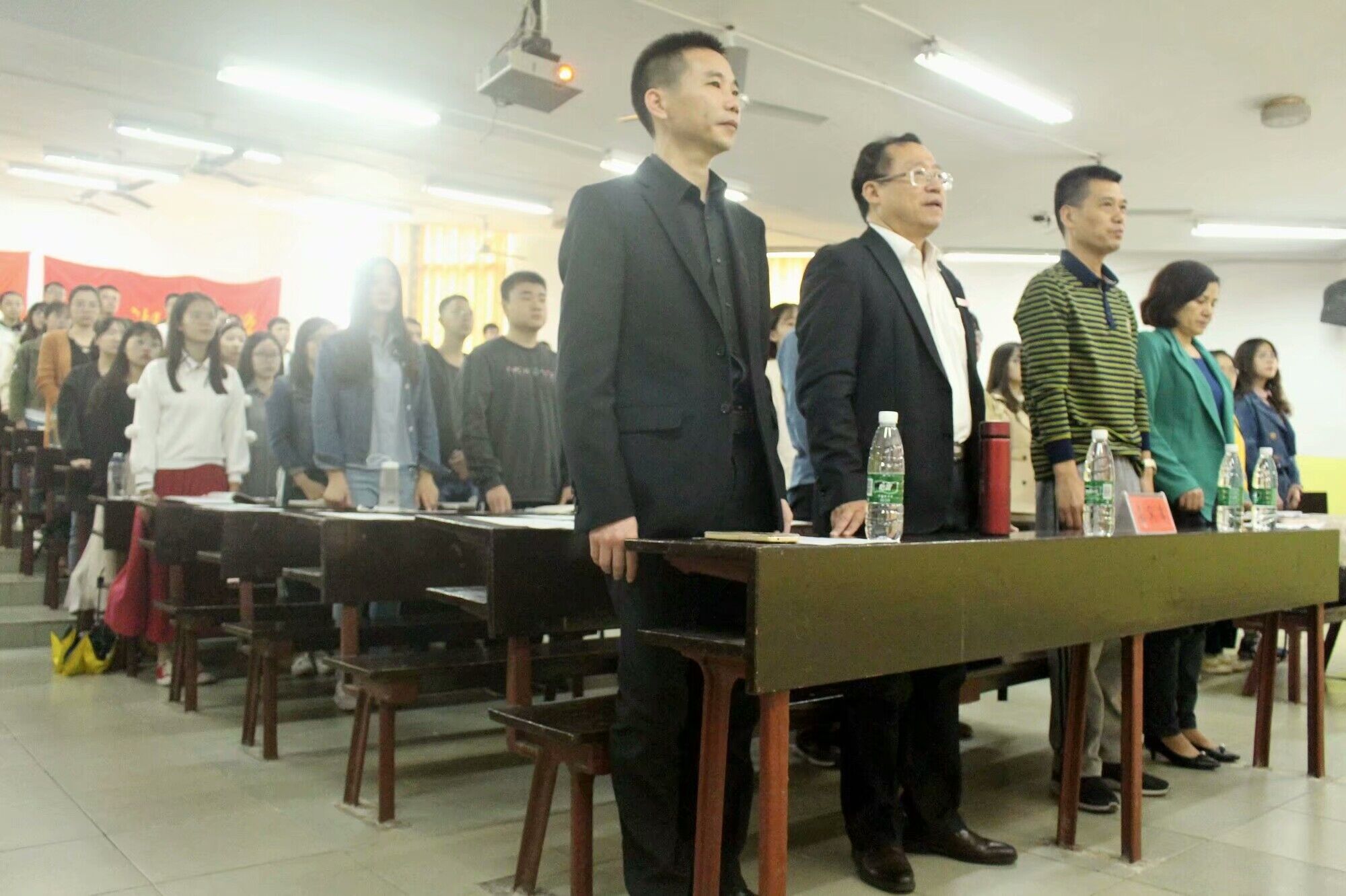 典礼第一项,由罗益花书记对本次发展对象培训活动做了简要介绍,随后全体起立,奏唱国际歌。大家神情认真,会场内庄严肃穆。