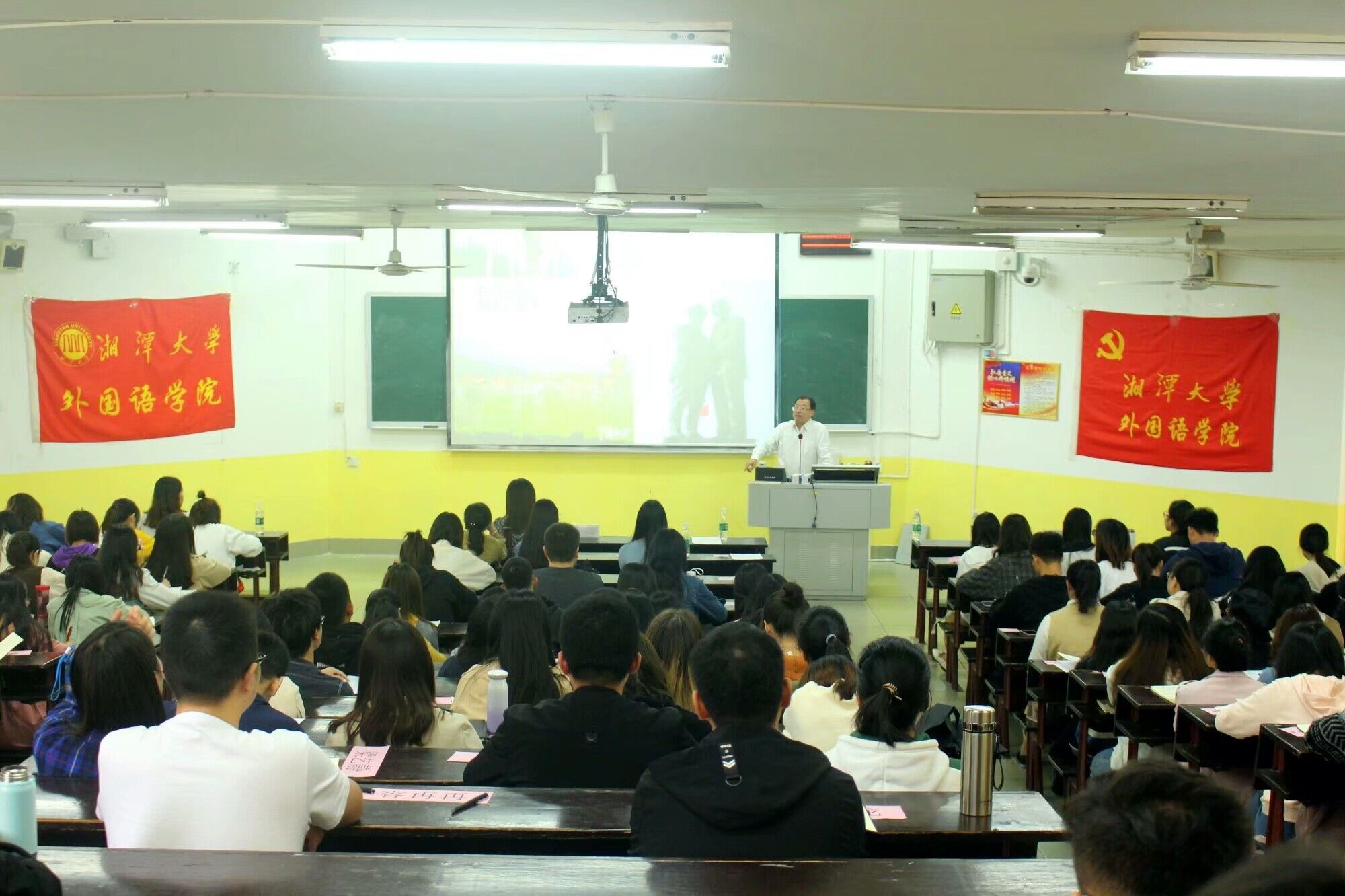 首先,由外国语学院党委书记罗益花为同学们邀请教授、博士生导师、副校长刘建平同志为同学们进行本次以红色文化与理想信念教育为主题的授课。台下掌声雷动。授课正式开始。首先,刘建平教授带领着同学们回忆过去峥嵘岁月,为同学们讲述了遵义会议,讲述了糖心AV