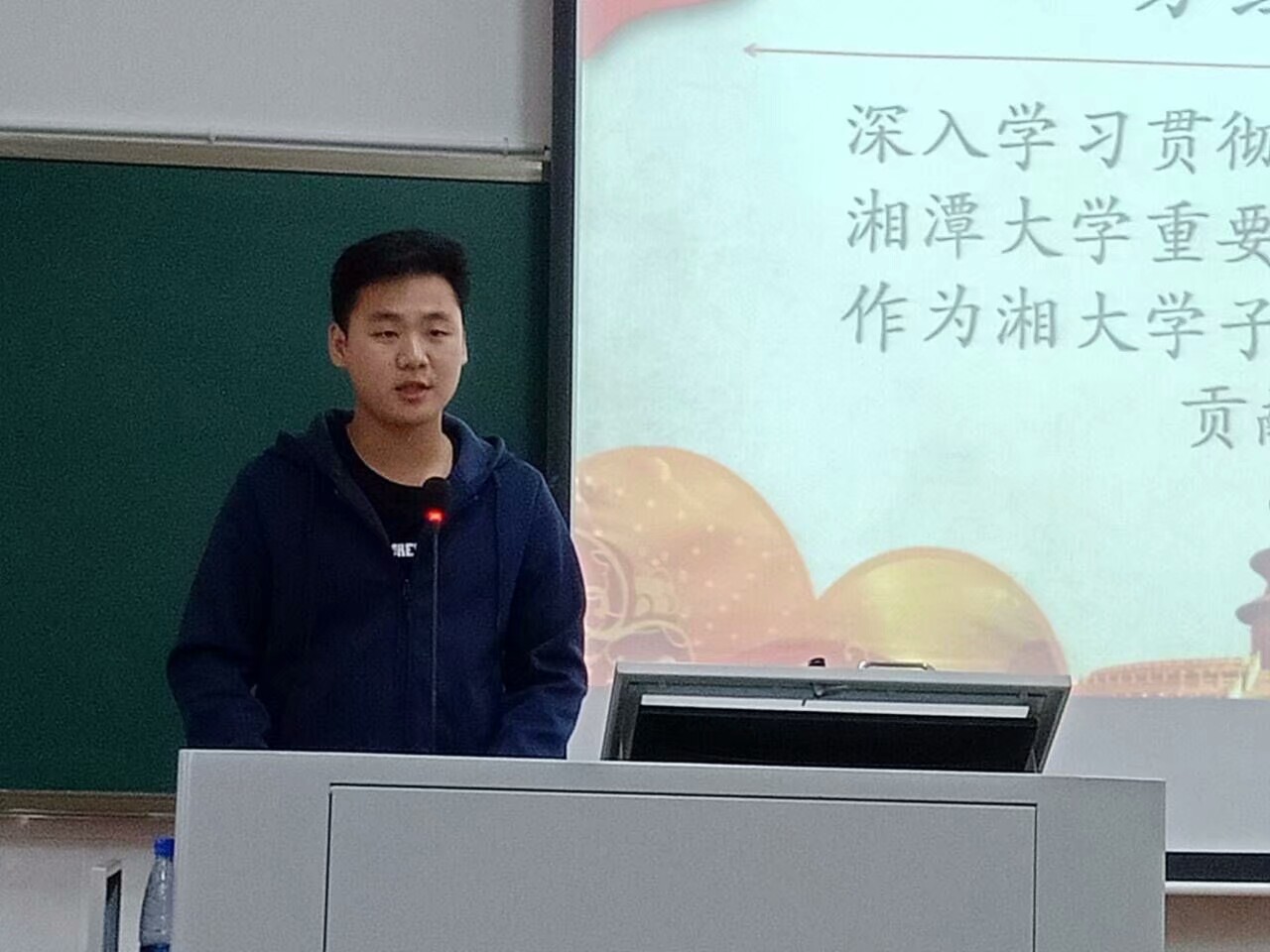 重要批示精神,谈谈作为湘大学子如何为湘大发展贡献力量”这一问题展开激烈的讨论和深入的思考与探究。同学们各抒己见,积极踊跃地提出新的见解与看法。15分钟激烈的讨论之后,每个组分别派两位同学上台汇报。一位同学负责展示分组讨论的成果,一位同学讲述自己近期的学习心得。