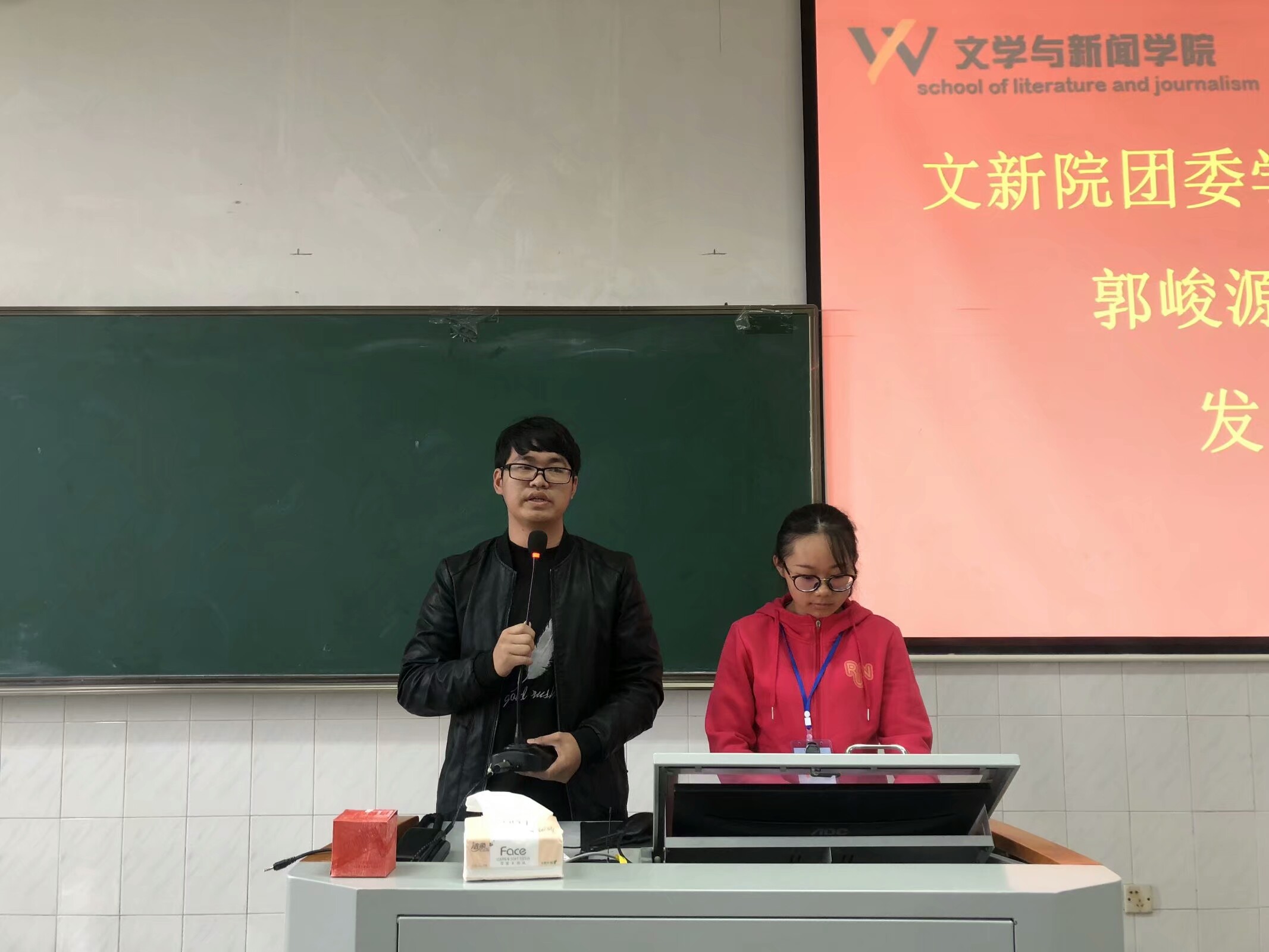 第一项,由团委学生会主席郭峻源发表讲话,就团课培训进行了简单的交流。他着重讲述了两名优秀党员的故事,一位是花园社区书记罗桂平,尽管他只是一名普通党员,但心系群众,努力向政府以及社会争取物资和支持,承建社区文化广场,为居民谋得福利;另一位是光明日报记者唐湘岳老师,为了振兴乡村学校建设不辞辛苦跟踪报道,督促政府更好的筹建乡村教育建设。郭峻源主席意在勉励在场各位同学心怀奉献与服务精神,不要认为自己力量微小而不去付诸行动。