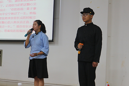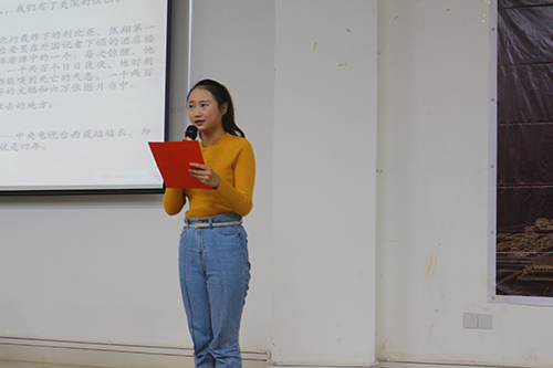 主持人宣读结束后,比赛继续进行。下一位选手为来自17新传三班的7号选手赵东宇同学,其带来的朗读作品为《我深深爱恋的祖国》。“我深深爱着我的祖国,搏动得得心脏跳动着五千年的脉搏……”其朗读慷慨激昂,激情饱满,气势磅礴,让人不禁热血沸腾,配上深沉高昂的乐奏,相得益彰,更是激奋人心,其优秀的表演赢来台下热烈非凡的鼓励。紧接着为来自17新传三班的8号选手林依欣同学带来的《大漠敦煌》,“我想找到三苗人留下的陶器,让它盛满历史的冷热与苍茫……”朗朗有声,满怀激情,响亮豪迈,感情真挚,让人不自觉为其精彩的表演鼓掌。而后是最后一位个人选手,来自17中文一班的9号选手向维维同学,其朗读作品为《我用残损的手掌》。与前面几位的慷慨激昂相比,向维维同学的朗读更多的是平静与柔婉。“嫩柳枝折断,有奇异的芬芳……”亲切而又自然的朗读声给人更增添一丝丝好感,蕴藉深远,耐人寻味,以平静宁和开始,以高昂激情结束,引起台下如雷掌声。