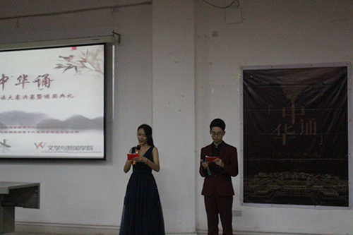 最后,获奖名单已评定完毕。个人奖中,一等奖由张慧敏同学荣获,二等奖由向维维与赵东宇同学荣获,三等奖由林依欣与谭韵同学荣获。小组奖中,优胜小组奖由李京桦,周迎新,张凯三位同学共同荣获。同时由各评委与嘉宾上台为他们颁奖。中华经典的千年古韵,仿佛还在我们的耳边回响。悠悠书声,诵不完古韵的悠扬铿锵,至此,本次“中华诵”经典诵读大赛圆满结束。