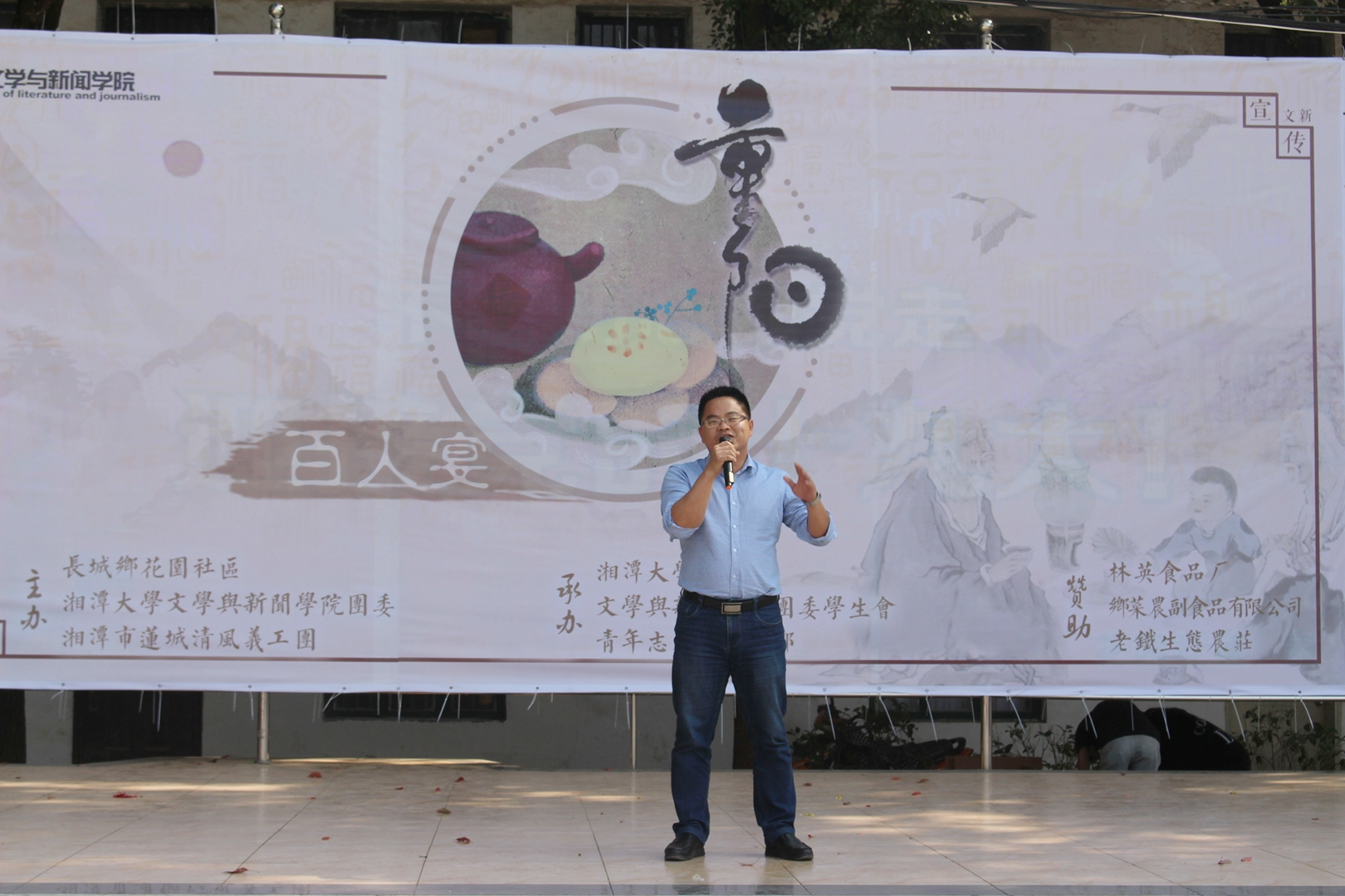 党委副书记陶永峰老师登台讲话。陶书记将活动开展情况总结为“五好”:第一,是时间好。本次百人宴活动举办的时间是在党的十九大胜利闭幕之后,正值重阳佳节。活动的举办既是我们认真学习贯彻落实党的十九大精神,带领青年学生及莲城义工践行社会主义核心价值观,又是对中国传统“敬老孝老”文化的大力弘扬。第二,是天气好,艳阳高照,清风徐徐,天公也作美。第三,是心情好。百人宴活动的顺利开展,老年朋友和青年志愿者心情都很好,大家都是笑靥如花。第四,是活动形式好,将学习贯彻落实党的十九大精神以一种人民群众喜闻乐见的形式开展,非常的生动活泼。第五,是期望“越来越好”,衷心祝愿老人们的身体越来越好,人民群众的生活越来越好,祝愿我们的国家越来越好!全场响起热烈的掌声。