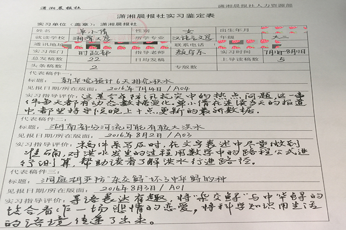 聊到参加“湘大传媒人”比赛拿到第四名的好成绩时,单小倩笑着说自己其实是“无心插柳柳成荫”。抱着试试看的想法,她参加了这个比赛。没想到之后却一路过关斩将,到达了最后一个环节,最终拿到的是三等奖。当时湖南省著名诗人也是《潇湘晨报》的新闻研究室主任李杰波(笔名:李不嫁)在比赛结束后对她说:“你的水平应该是拿二等奖的”。“我没想到老师会关注我,而且还这样认可我,除了惊喜更是感谢。”因为这次比赛,大二暑假,单小倩去了潇湘晨报社实习,谈起这段经历,单小倩多次感慨自己遇到了一个好老师。在实习期间,单小倩发表过多篇新闻报道。