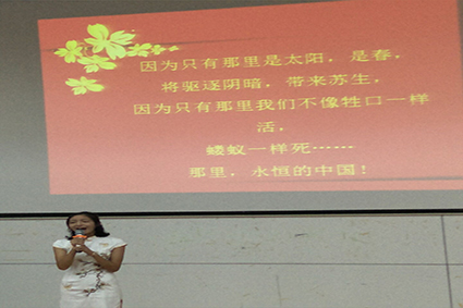 首先出场的是一号选手,来自15新闻2班的李婉琼,身穿旗袍的她深情地朗诵了一首《我用残损的手掌》,对祖国的深深爱意溢于言表;“这是在世界东方喷薄而出的,希望的中国!这是在中国共产党领导下的,辉煌的中国!”来自16中文2班的二号选手刘美辰用《青春中国》表达了她对祖国的崇敬;三号选手16广电1班的张玲的《中华颂》将历史的烛火重新点燃,将亘古的诗行再次唤醒;四号选手是来自16中文2班的刘胄昕,她带来的《祖国啊,我的祖国》歌颂了祖国的历史与民族之魂;来自15新闻1班的五号选手周海娟带来的《长征·重征》使我们仿佛回到了那个硝烟弥漫的年代;六号选手李乾的《我的祖国》更是使会场扬起阵阵中国风。