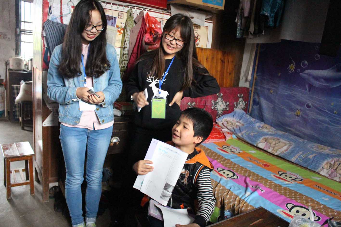 余下志愿者们去到小朋友家。爸爸妈妈外出打工了,他平时就跟爷爷奶奶在一起住。志愿者们刚去的时候,小朋友在洗他的鞋子,洗好后就把他的鞋子挂在了花盆里的小棍上。这位四年级的小学生和这些志愿者姐姐们并不陌生,从去年开始,志愿者们就定期去他家里,为他辅导功课,陪他玩游戏。志愿者们教小朋友读英语,学数学,他在学习上的问题都尽力帮助他解决,小朋友也热衷于将自己平时积累的谜语都拿来考考姐姐们。这是一个乐观开朗的小家伙,热情地给大家讲他的有趣故事,大家在一起度过了一个开心而充实的上午。
