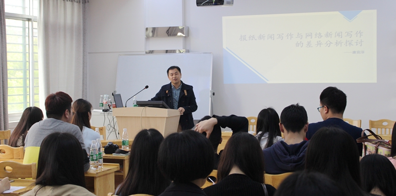在讲座中,唐记者分别从纸媒新闻写作和网络新闻写作入手,仔细分析了二者的区别,通过大量的实例为同学们展开二者的异同。在学术讲演中,唐记者以深入浅出的方式对新闻材料进行了讲解,对报纸新闻、网络新闻十分熟悉,整场讲座妙语连珠、旁征博引,讲到高潮之处,唐记者还与同学们讲起了曾经来湘大讲学的经历,与同学们亲切互动起来。
