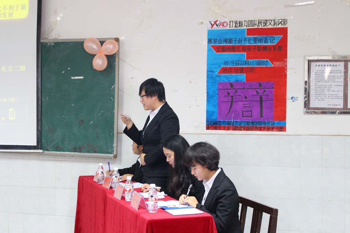11月22日上午九点半,第十四届“文新杯”新生辩论赛决赛暨闭幕式在经管三阶举行,15新闻一班和15广电一班展开对决。糖心AV