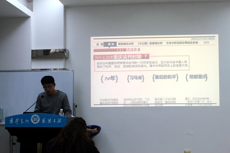学术论坛在热烈的氛围中继续进行,2015级新闻与传播专业研究生王宁同学为大家带来一场题为重庆谈判时期大公报舆论研究的新闻史的研究报告。在他的讲述下,同学们对那段时间的历史有了一个较为全面的了解,对当时的新闻事业也有了一定的了解。唐老师欣赏的评价道,这是一场已经入门,知道怎么做研究的同学的发言。同时也提出了提升的建议,相信在坐的每一位同学都学到了不少知识。