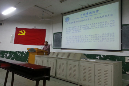 首先,唐书记为大家展示了许多中国资源现状不容乐观的实例,使大家认识到了中国在自然资源供给上面临巨大压力,同时也面临着严峻的生态环境挑战。接着,唐书记又引出中国的人口问题,指出我国人口总量持续增长,人口出生性别比失衡等人口系统面临的主要挑战。这样的人口问题,也使就业压力成为当前中国面对的最大挑战,养老问题也成为未来潜在的巨大问题。