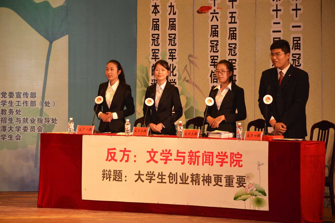 。正方辩题为大学生创业能力更重要,反方辩题为大学生创业精神更重要。本场比赛主席为吕佳学。正方辩手分别为一辩宋金亮,二辩黄宝莉,三辩郑琦,四辩杨帆。反方辩手分别为一辩李贺,二辩薛珊,三辩臧雪文,四辩吴栋鹏。在双方辩手自我介绍完毕并对对方辩友致以友好问候之后,本场比赛正式开始。