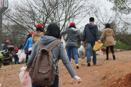 下午1:30,所有志愿者在南门集合完毕并准时出发。志愿者们乘坐107路公交车来到目的地,分组捡拾垃圾。来到湘江边时,岸边被各种垃圾覆盖。由于上午下雨,地面湿滑,水位上涨,为志愿者们的活动添加了不少的困难。志愿者们也并未抱怨,蹲在地上开始细心地捡拾垃圾。没多久,大家准备的口袋里就已装满了垃圾。岸边的垃圾捡拾完毕后,志愿者又来到堤坝内捡拾垃圾。志愿者们的鞋子上都沾满了泥,有些志愿者的衣服都弄脏了,但是大家并没有说什么,反而为自己能够为保护湘江尽一份力而感到高兴。