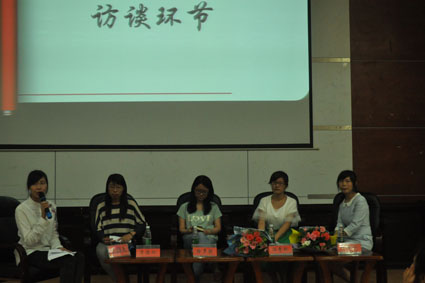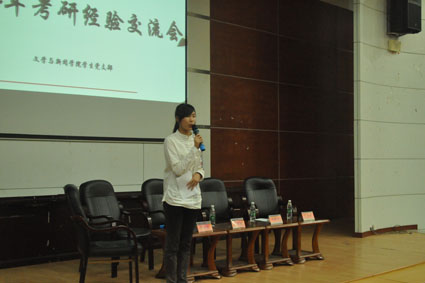 在对汪青玲、李云芳、李海玲、徐多懿四位同学做了简短的介绍后,主持人针对如何确定考研目标、政治和英语如何有效的复习以及各个科目参考资料的推荐等问题向四位学姐请教。而她们也都针对自己所报考的专业提出了相应的应考策略。特别是推荐的一些书籍更是让在场观众获益不少。随后,四位学生嘉宾分别系统的介绍了她们的复习技巧。徐多懿学姐强调了课堂听讲的重要性,也提醒大家要注意各个高校的出题风格;李海玲学姐则侧重讲述了时间的规划和应试技巧;汪青玲、李云芳两位针对考研辅导班和共享复习资料方面提出了一些建议。李云芳学姐还特别提到了要有自信,并说明了自己去参加面试时考官对湘大学生的称赞。最后,同学们用掌声感谢她们的分享和到来。