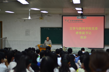 党委唐春副书记致辞。伊始,他表达了对第十四届学生会新干事的殷切期盼。希望干事们看清楚学生会为同学服务的目的,在拥有更多与大家接触机会的同时,服务大众、心系同学,而不仅仅将学生会当做锻炼自己与提高自身能力的平台。然后,他叮嘱新干事们牢记自己在校学生这一身份,在日常学习生活中,维护自己的形象,提高学习成绩。在班级当中,也要多参与班级劳动,发挥榜样作用。之后,唐春副书记又送了两点建议给全体同学。首先,不同省份、不同性格的同学们要团结起来,把各项事情做好,使学习生活丰富愉快。再有,各位同学要在不耽误学习时间的前提下做好学生会的工作,更好地为大家服务。对此,整个团委学生会要展开深入讨论,促进干事们工作的开展。最后,唐春副书记祝愿大家可以很好地完成各项任务,在学习生活上都有收获。