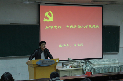 接下来,成志刚书记提出了要做优秀的党员:首先要了解党员的标准,条件。并详细的解释了党员标准,尤其强调了党员要全心全意为人民服务,要求同学们时刻谨记;第二,要正确认识当代学生党员的责任。成书记提到,同学们的首要任务就是学习,指出现在的学生没有学习的紧迫感。并介绍了学习的三种境界为苦学、好学与会学以及学习的三个阶段为学知识、涨智慧、塑精神,提倡大家学以致用,活学活用。成志刚书记还热心的与大家分享了《存在与虚无》、《法哲学及其方法》、《国富论》等好的书籍,足见书记对大家的关心的激励。最后,要加强党性修养。成书记讲到:有政治觉悟性,政治的敏感、敏锐性,这样才能保证正确的方向。