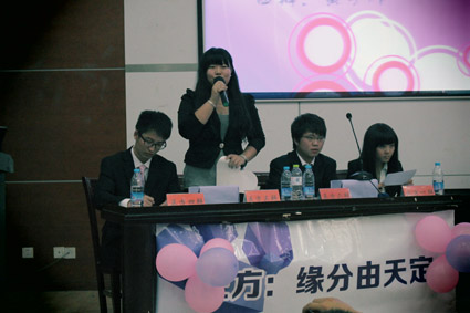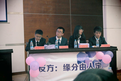 在观看过趣味横生、富有创意的视频,领略了辩论队风采之后,“文心杯”新生辩论赛表演赛正式开始。此次表演赛辩手均为11级辩手,正方辩手分别为:一辩向娴、二辩尹泉、三辩李元直、四辩黄宇炜,反方辩手分别为:一辩郭睿昊、二辩张铭萱、三辩张柳以及四辩贾晓旻。正反双方辩论的观点为“缘分由天定”还是“缘分由人定”。