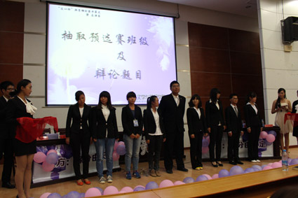 至此,表演赛圆满结束。之后主持人为大家介绍即将带领新生走上辩论赛场的辩导们,他们分别是:13汉语言文学1班辩导舒爽爽、13汉语言文学2班辩导侯琬盈、13汉语言文学3班的辩导黄立意、13新闻学1班辩导吴双、13新闻学2班的辩导徐颖慧、13广播电视学1班的辩导黄江浩、13广播电视学2班的辩导李莹莹、13广告学1班的辩导孙振宇以及13广告学2班辩导贾煜。领略过各班辩导风采之后,主持人宣布本届“文心杯”辩论赛将在本周进行预选赛,届时将淘汰一个班级,剩下的八个班级一一进行角逐。最后,各新生班级负责人抽取参加预选赛的班级及辩题,将在本周参加预选赛的两个班级是正方:13新闻学2班,反方:13广告学1班。预选赛的辩题为:社会安定是靠法律维护还是靠道德维护。