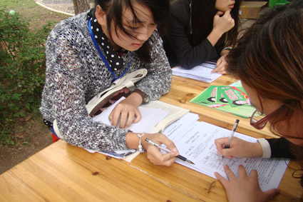 阴沉的天气阻挡不了大家献血的热情,北苑献血处前来咨询﹑献血的同学络绎不绝。青志部的志愿者们亲切耐心地为大家解惑答疑,指导填写献血单,并且在献血结束后为献血者提供一些小纪念品以资鼓励。在采访中,很多同学都表示,为国家公益事业做出贡献,不仅是一种荣誉,更是当代大学生的责任。记者采访到一位前来献血的的11级新闻班的同学,当问及如何看待“爱心血库”活动和义务献血时,已是第二次献血的她说道:“这是大学生应该做的,我们应该为社会贡献自己的力量,希望能够帮助到需要的人。”