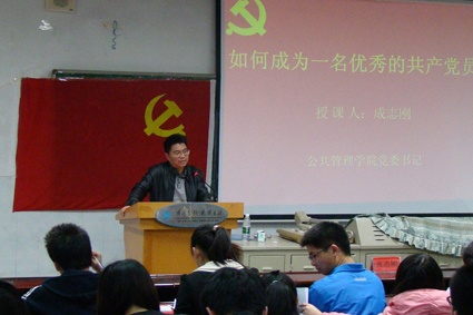 授课伊始,成老师便提出,在当今世界形势和中国国际地位不断提高的情况下,世界的竞争是科学和人才的竞争,而这也是开展大学生入党培训的一个重要原因。他强调了端正入党动机的重要性,并向在座学生介绍了中国共产党的性质以及入党的基本条件。在谈到当代大学生的责任问题时,成老师指出:“作为学生党员,要铭记学习是天职,要联系理论实际,不断提高自身的实践能力,要增强党性修养,为同学树立榜样,发挥党员的先锋模范作用。”成老师还鼓励同学们多读书、读好书,多去领略经典著作的魅力,同时,通过有效的学习方法,在带有批判性眼光的学习之中,多反思,多总结,努力成长为优秀当代大学生。