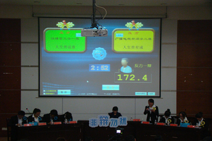 辩论队的8位11级辩手依次登台,为大家呈现了一场精彩绝伦的比赛。正方所持观点为“城市幸福感排名值得认真对待”,开篇立论环节,正方一辩运用富有诗意的话语娓娓道来,并以全国典型城市为例,举出大量数据进行论证。反方一辩则从“调查机构不规范,调查方法不科学,调查样本不合理”三个破题论证“城市幸福感排名不值得认真对待”。在自由辩论环节,双方辩手唇枪舌剑,交替发言,将比赛推向高潮,双方在“幸福感”与“幸福感排名”的区别、调查数据的来源与科学性方面展开激烈辩论,惊人的语速、犀利的言辞使得现场掌声连连爆发。