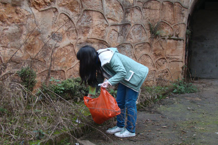 金翰林处在繁华商业地段,小广告和垃圾较多,但是志愿者们热情高涨,在领取工具之后,马上开始工作。处理墙上的小广告,要先用水打湿贴纸,再用铁刷子一点一点刷下去,由于天气寒冷,志愿者们握着刷子的手被冻得通红,但大家都很认真地坚持着。在金翰林桥下的沟里,常年堆积着无人清理的垃圾,社区志愿者和文新院的志愿者们一起向“顽疾”发起进攻,最终清理出十多袋垃圾。