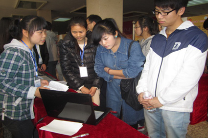 第九届“挑战杯”大学生课外学术科技作品竞赛在学生活动中心一楼拉开帷幕。上午8点30分到11点30分为此次比赛领导师生参观和专家评委预审时间。我院团委书记管胜昔老师出席本次活动,并针对参赛作品与选手亲切交流。