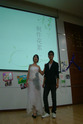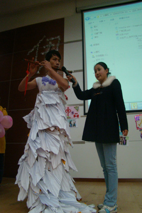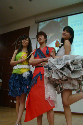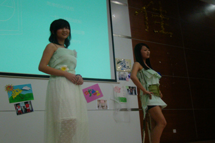 接下来活动进入主要环节,12级九个班级各显神通,展示他们的创意与环保精神。12新闻一班以“燃梦”为主题,由环保袋做成的火红衣裙,就像一簇火焰点亮了现场。12中文三班则以蚊帐化婚纱,模特随着音乐翩翩起舞,如梦似幻的意境使人心醉。12中文一班的裙子由彩纸和垃圾袋做成,粉红的颜色正应了那句“桃之夭夭,灼灼其华”。12广告一班的两套衣服以“绿野仙踪、在水佳人”为主题,嫩绿的色调体现了春日的清新与鲜活感。12广电一班的服装创意十足,模特展示情景剧《白蛇传》引全场掌声不断。12广电二班给他们的三套衣服取名为“虹之绽”、“光之初”、“雪之莹”,从名字就可以看出他们的用心。12新闻二班的长裙以“水墨风荷”为主题,白色的蚊帐下是若隐若现的水墨荷花,充满诗意。12中文二班的创意格外吸引眼球,男女生搭配表演“美女与野兽”擦出火花。12广告二班的模特穿上用废旧打印纸做成的长裙,男扮女装也优雅。
