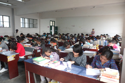 考场里早早便坐满了参加考试的学员,他们不浪费最后一点时间,积极为考试做准备,相互提问或默默背诵。考试开始后,大家抓紧时间答题,没有丝毫懈怠,可见大家对团课结业考试的重视程度。