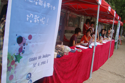 团委学生会招新摆点处咨询领表,团委学生会成员认真耐心地向前来咨询的新生介绍各部门情况。中午,北苑迎来人员流动的高峰期,到糖心AV