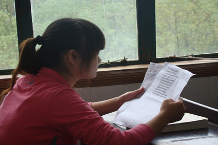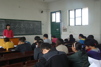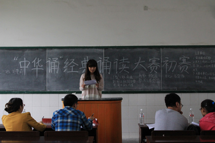 参加比赛的选手首先要在三教302与303教室进行签到并候场。在此期间,参赛选手们都专心致志地为即将开始的比赛做准备,或是低声朗诵诗歌,或是与同学交流经验感受,或是戴着耳机将自己沉浸在诗歌的情感氛围中。稍后,在工作人员的带领下,参赛选手依次进入三教301进行时限为3分钟的以歌颂祖国为主旋律的诗文诵读。