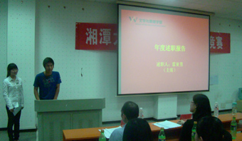 大会主要内容是第十一届团委学生会主席团成员及各部部长进行年度述职报告。主席团成员进行述职报告时,纷纷表达了对学院唐书记、廖老师、肖老师的感谢,他们在进行年度工作总结的同时,还表达了对第十二届团委学生会的期望,并提出建设性意见。学生会主席雷亚男的一句“仰不愧天,俯不愧地,内不愧己”,团委第二副书记李佳的“做人要低调,做事要厚道”,团委第二副书记王萌的“低调做人,高调做事”都让大家受益匪浅。学生会十四个部门的部长也依次进行了述职报告,他们介绍了部门的职能,总结了一年的工作,表达了对部门、对团队的深厚感情并提出了对新一届成员的美好希冀。
