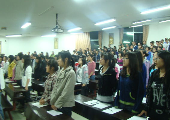 本次团课还播放了09级学生的军训视频,目的在于教育10级新生在军训期间要有团队意识、艰苦精神。