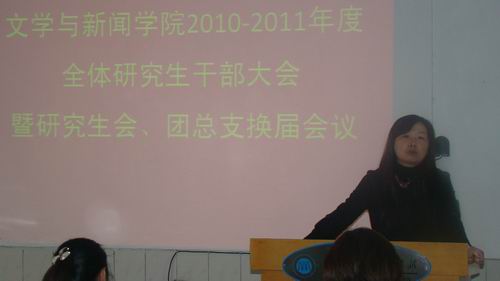 刘璐老师首先总结了第九届研究生会、团支部在过去一年里所做的工作,并对研究生会、团支部所做的工作表示充分肯定。她说,在研究生会主席刘娟的带领下,研究生会各项工作都取得了非常不错的成绩,在联系老师与研究生之间起到了不可替代的桥梁作用,真正为学院服务、为广大研究生服务,她本人对此非常满意。