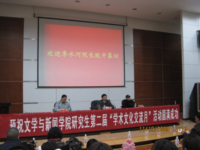 “学术文化交流月”活动的成长轨迹。在DV短片播放完后,季院长宣布第二届学术文化交流月活动正式开幕。接着,同学们满怀激情地倾听了副院长雷磊教授对活动做的动员讲话。雷磊教授建议大家在读研期间注重阅读,把读书的心得写下来。最后,雷磊教授介绍了第二届“学术文化交流月”活动大体情况,并对本次活动进行了工作部署。