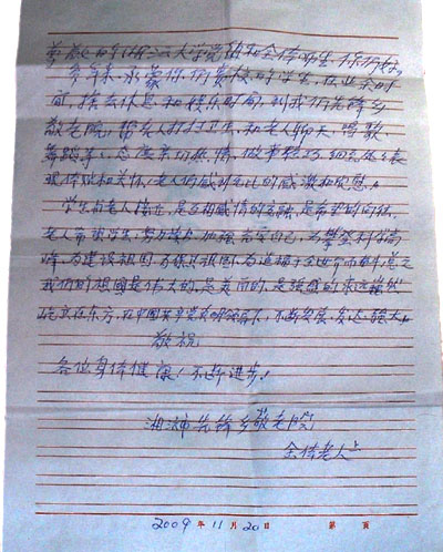 11月20日,中文党支部收到了敬老院送来的感谢信,内容如下: