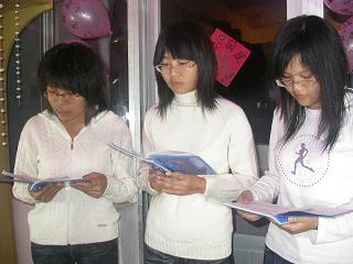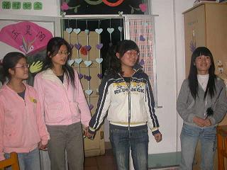 稍后,我们来到了北青女生公寓,女生寝室大多走温馨风格。07中文三班的423寝室更是让人眼前一亮。由门口含有“我思故我在”深意的“思洞”二字,就能看出屋主的细腻,屋主更是把自己比作快乐的小妖精,为这一室增添了一丝可爱。看过了崇尚废物利用节俭风格的613,评审之一的刘丰源学长给出经典的评价:简洁而不简单。615的两位屋主是走回归童年的风格,墙壁用剪纸装饰成了海洋与草地的样子,还有可爱的小蓝鲸和鲜花的点缀,令人耳目一新。两人更是请了另两位同学一同表演了才艺:合唱王心凌的《羽毛》。