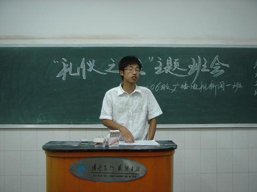 (本网讯 孙丽娜)5月20日晚,为响应全校倡起的“文明礼仪系列活动”,06广电一班在文科楼402召开“礼仪之班”主题班会。班会形式为主动发言和现场辩论,气氛活跃。
