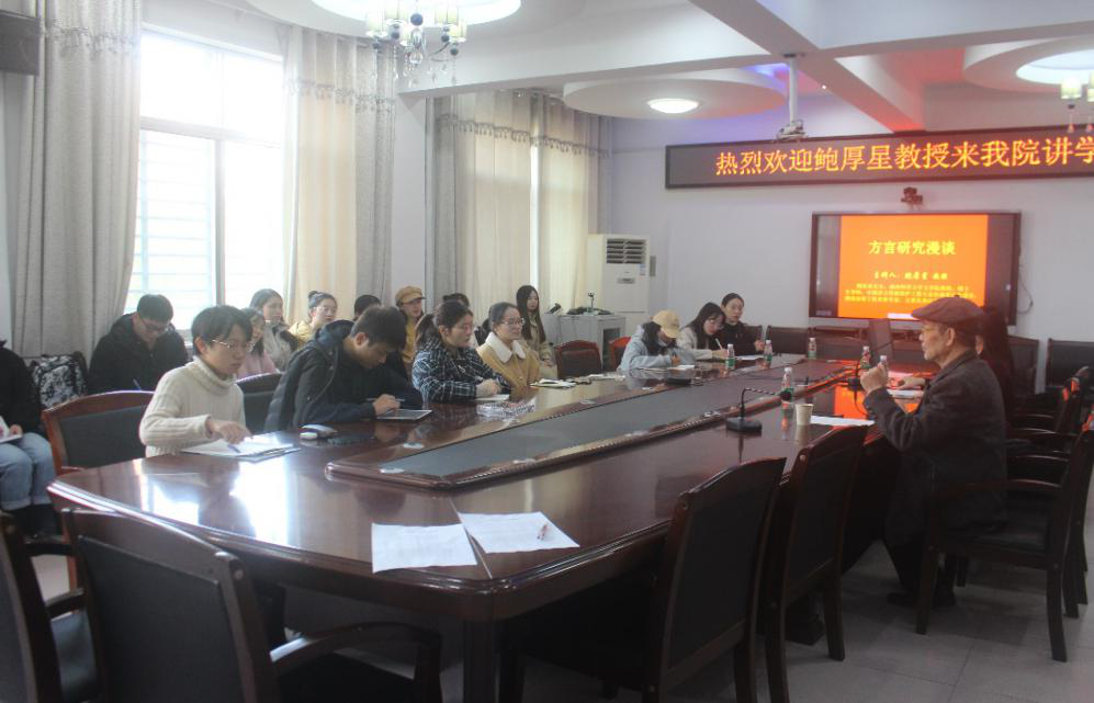 讲座中,鲍厚星教授以一种亲切自然的漫谈方式讲述自己的亲身经历体验和田野调查故事,向大家分享自身关于方言研究的一些心得体会。鲍厚星教授从三个方面论述了自己在进行方言研究时所采取的方法,分别是“知”与“行”、“广”与“狭”、“进”与“退”。在“知”与“行”上,鲍厚星教授提出,语言调查包括许多方面的内容,如音韵方面、语音方面、国际音标等。掌握了国际音标之后,是否可以把国际音标应用于方言调查,是否可以准确地写下发音人说出的音、韵、调,以此强调做方言研究要学会把理论运用于实践;在“广”与“狭”上,鲍厚星教授以自己读李荣先生的著作所得的“在你面前出现的不是山间小溪,而是江河湖海”的感受为例,告诫大家做学问研究最忌狭隘,需要以大量的文献资料来丰富自己,不能把自己束缚在一个狭小的天地里;在“进”与“退”上,鲍厚星教授以自己到湖南各地做方言调查为例,提出过去方言学是一个比较冷门的专业,搞方言研究要有坐冷板凳的思想准备,要懂得“进”与“退”,为调查研究创造各方面的条件。鲍厚星教授的讲述方式不仅营造了一种轻松自然的讲座氛围,同时也向大家传达了专业知识,独特又轻松的讲述风格让在场师生倍感亲切。