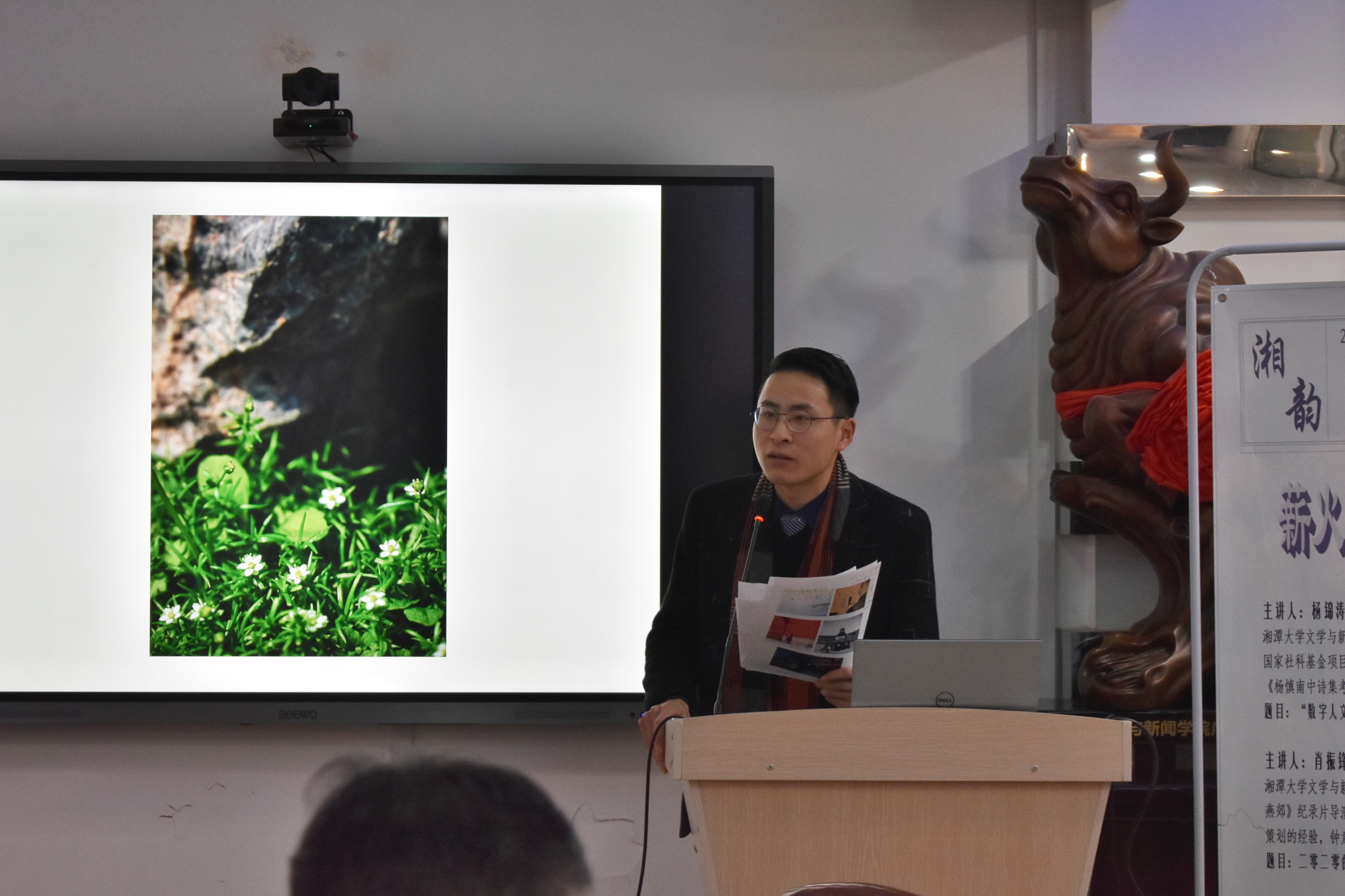 演讲——硕士研究生肖振锋,他主讲的题目是《二零二零的十个瞬间》。在为大家展示“十个瞬间”之前,肖振锋提到“写诗——是我独处的方式”这句话。他将这句话改成“摄影——是我独处的方式;诗歌——是我思考的方式”,以此来展现他独特的精神世界。接着,肖振锋为大家展示了他在2020年拍摄的十张精美照片。他结合声情并茂的诗文朗诵,为大家细细讲述定格在每一张照片背后的故事。