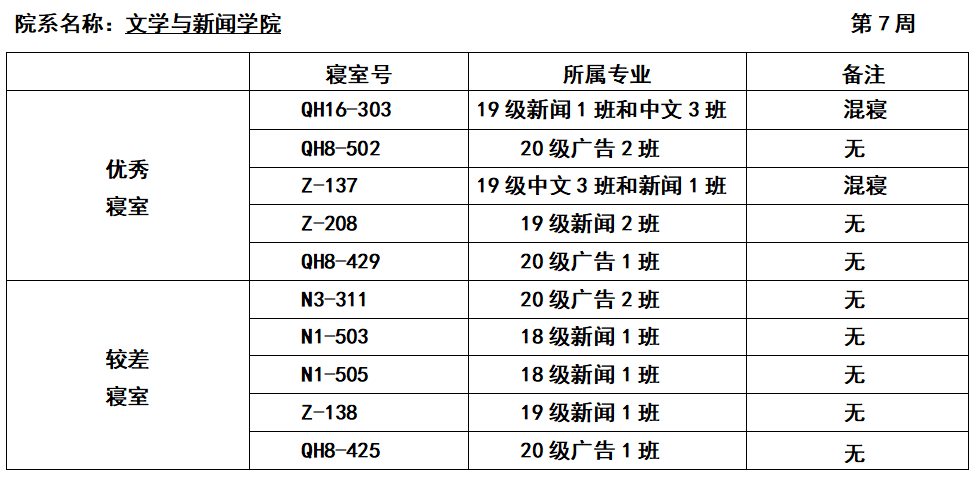 第七周寝室卫生寝风检查情况公示