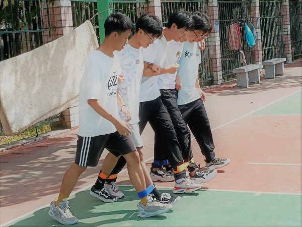 本次活动包括团队竞技与心得分享。第一个游戏考验配合,四人至五人一组,各持一段U型管道,每人将U形管道连接起来成为轨道,让乒兵球在轨道滑动。直到进入终点的兵兵球筒,用时短的一方获胜。在游戏过程中,有的小组一路畅通无阻,有的则状况百出,场地上不时传来观众的阵阵惊呼。第二个游戏考验团结,五人一组,相邻两人把脚系在一起,听口令一起走向终点。用时短的班级获胜,团队的力量在此刻彰显无疑,惟有拧成一股绳,才能走向终点。最后一个游戏考验默契,两两一组背对背夹着气球前进,顺利护送气球到达终点。在心得分享中,同学们用五彩斑斓的便签写下此次活动的收获,每一张便签上都跃动着一颗激动的心,充满了对大学的渴望与期盼。