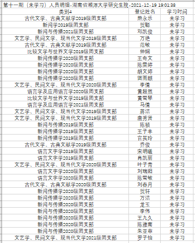 青年大学习第十二季第11期学习已截止,截止时间为12月19日晚七点。现将未学习名单公布如下。请各团支部书记今后务必认真督促团支部成员,落实每周青年大学习的完成。