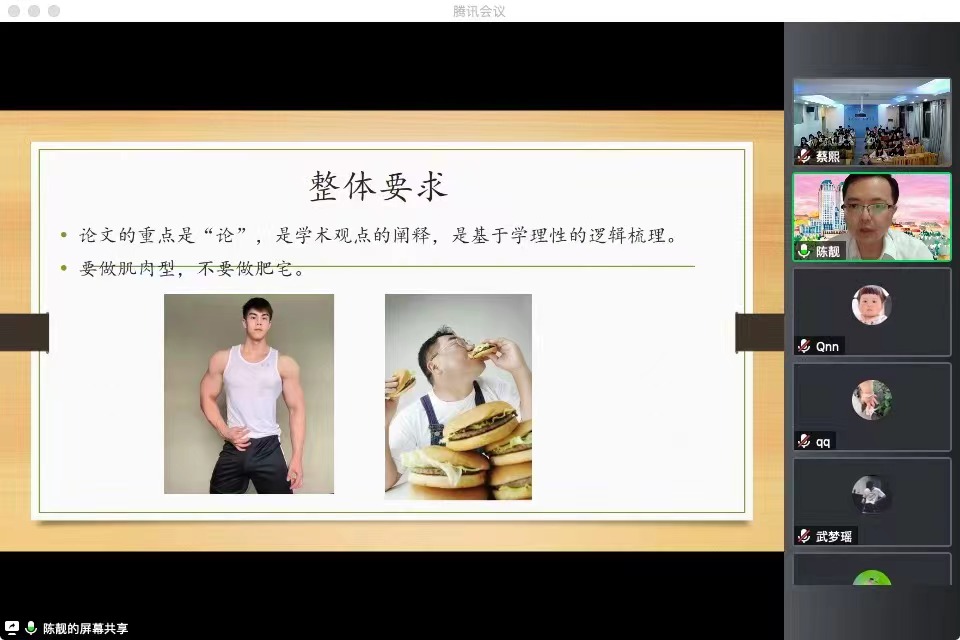 在答疑环节中,陈靓教授就大家提出的“如何凸显文章的主要论点?”“如何让审稿老师对自己的文章感兴趣”等问题结合自身经验和客观环境进行了亲切的解答。关于论文的创新,他认为理论创新有较高难度,推荐了选取新的文本、探索新的视角、采取跨学科的研究方式等方法。最后,陈靓教授鼓励同学们在论文写作中视角应有创新性和前沿性,进行文本分析时保持对文本的敏感度。
