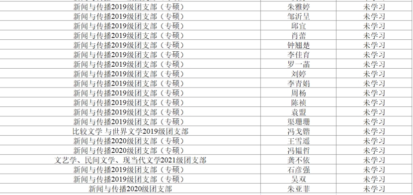 青年大学习第十二季第4期学习已截止,截止时间为10月24日晚七点。现将未学习名单公布如下。请各团支部书记今后务必认真督促团支部成员,落实每周青年大学习的完成。