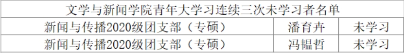 现对学院连续三次(第七期、第八期、特辑)青年大学习未学习同学进行通报批评。连续三次或累计五次未学习,取消本学年五四评优、下一学年优秀研究生干部、三好研究生等评优资格。