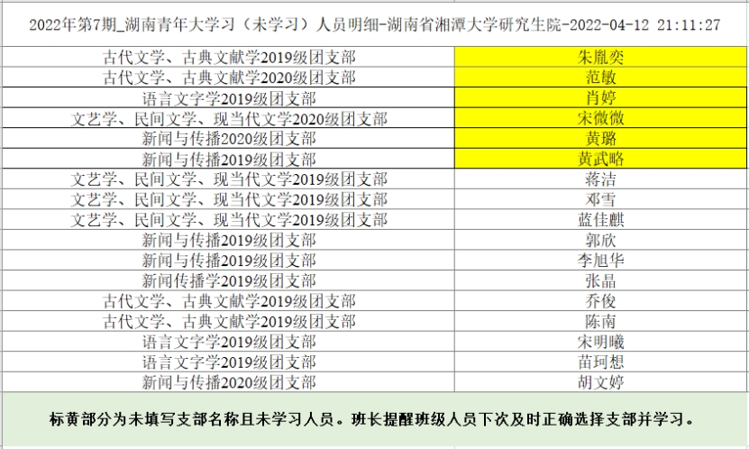 青年大学习2022年第7期学习已截止,截止时间为4月10日晚七点,现将未学习名单公布如下。请各团支部书记今后务必认真督促团支部成员,落实每周青年大学习的完成。